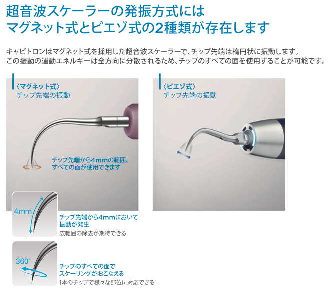 マグネット方式のキャビトロンは刺激がマイルドで、従来のピエゾ方式の超音波スケーラーと比べて、痛みなどの不快感が